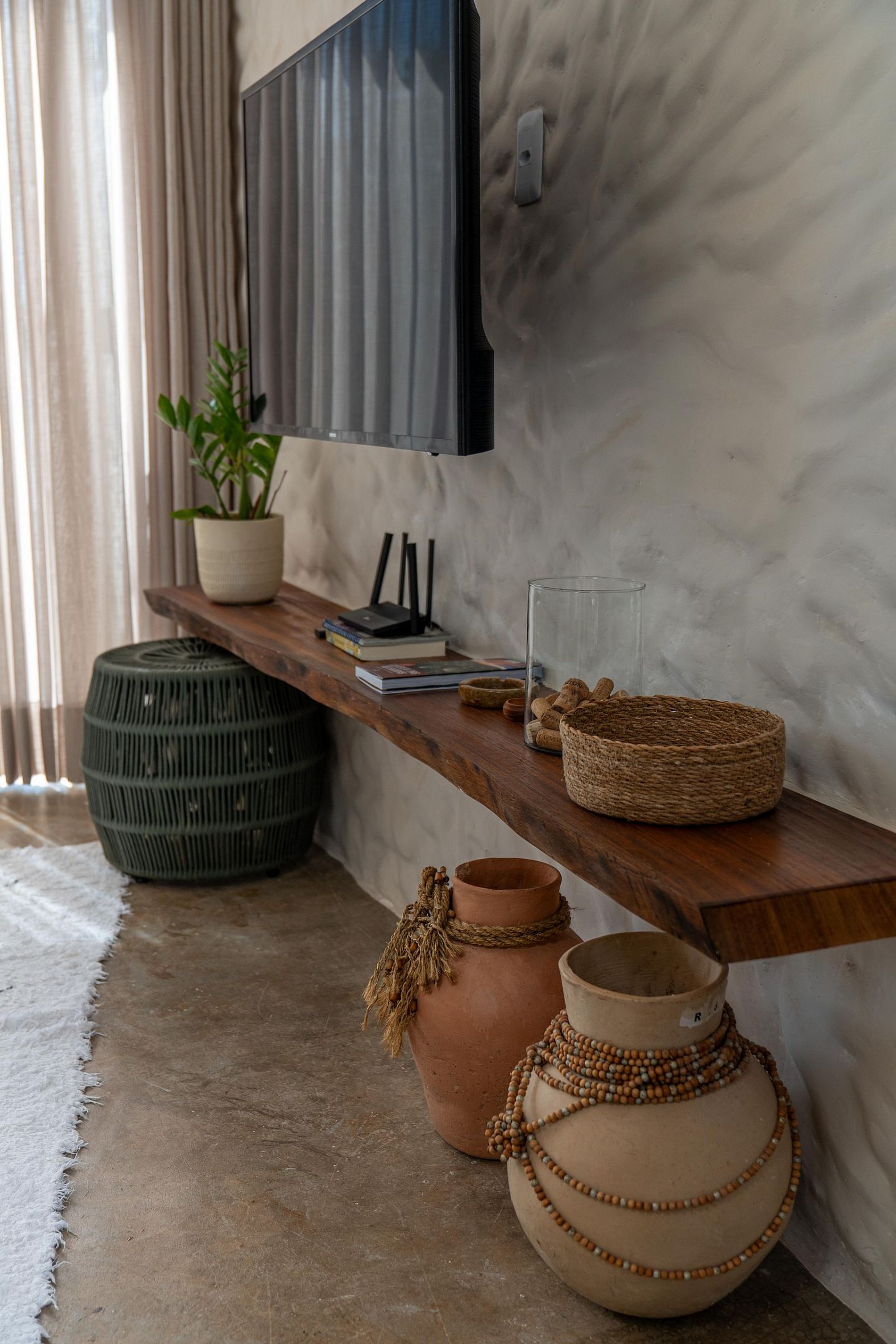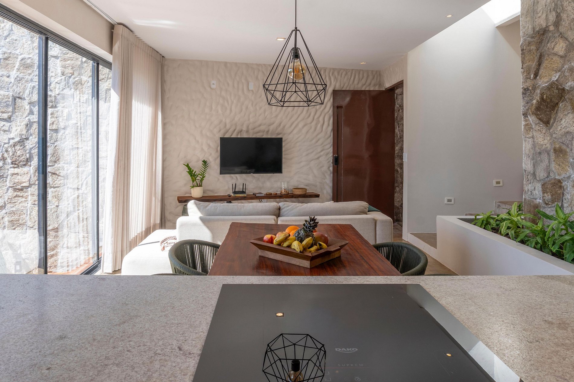 A sala de estar também foi pensada para ser um confortável espaço de home office, com a natureza da Chapada como cenário de fundo.