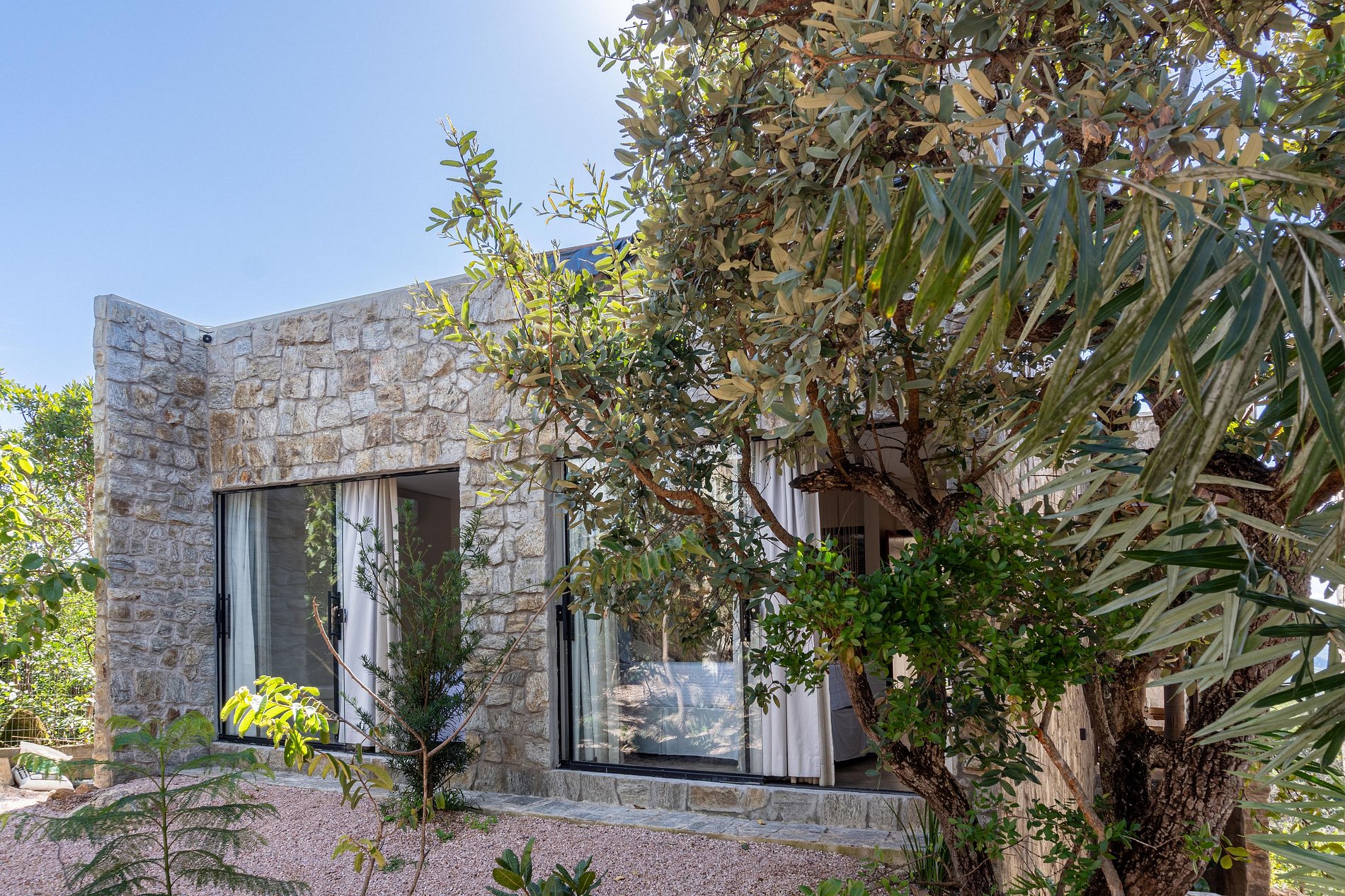 Os chalés foram cuidadosamente projetados para proporcionar máxima conexão com a natureza. Por isso, grandes portas, janelas e claraboias de vidro predominam na arquitetura, trazendo abundante luz natural e integrando o verde da paisagem a cada espaço do chalé.